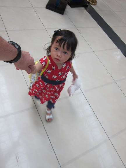 Our gate changed and luckily it was the gate already printed on the ticket, so we got there just in time. Any earlier and we could have missed the announcement as it was barely audible. Talia made friends with two teenage girls behind us on the plane -- no surprise there. She started by peeking at them through the seats. Then they started reciprocating by putting their fingers through the seat as she swiped at them! She is very inquisitive and likes to show off (as I'm learning each day). Yesterday she did Chinese dance choreography with a chop stick in each hand for all the waiters and waitresses in the Chinese restaurant. All Talia needs is someone to laugh at her and it goes on and on and on...hmm...sounds like another little girl I know - eh em, Harper! It was hilarious to watch her personality come to light for me!